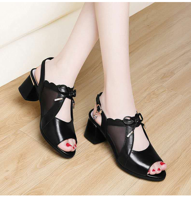 صندل راقي من قماش شبكي وجلد بقر بكعب عالي عريض